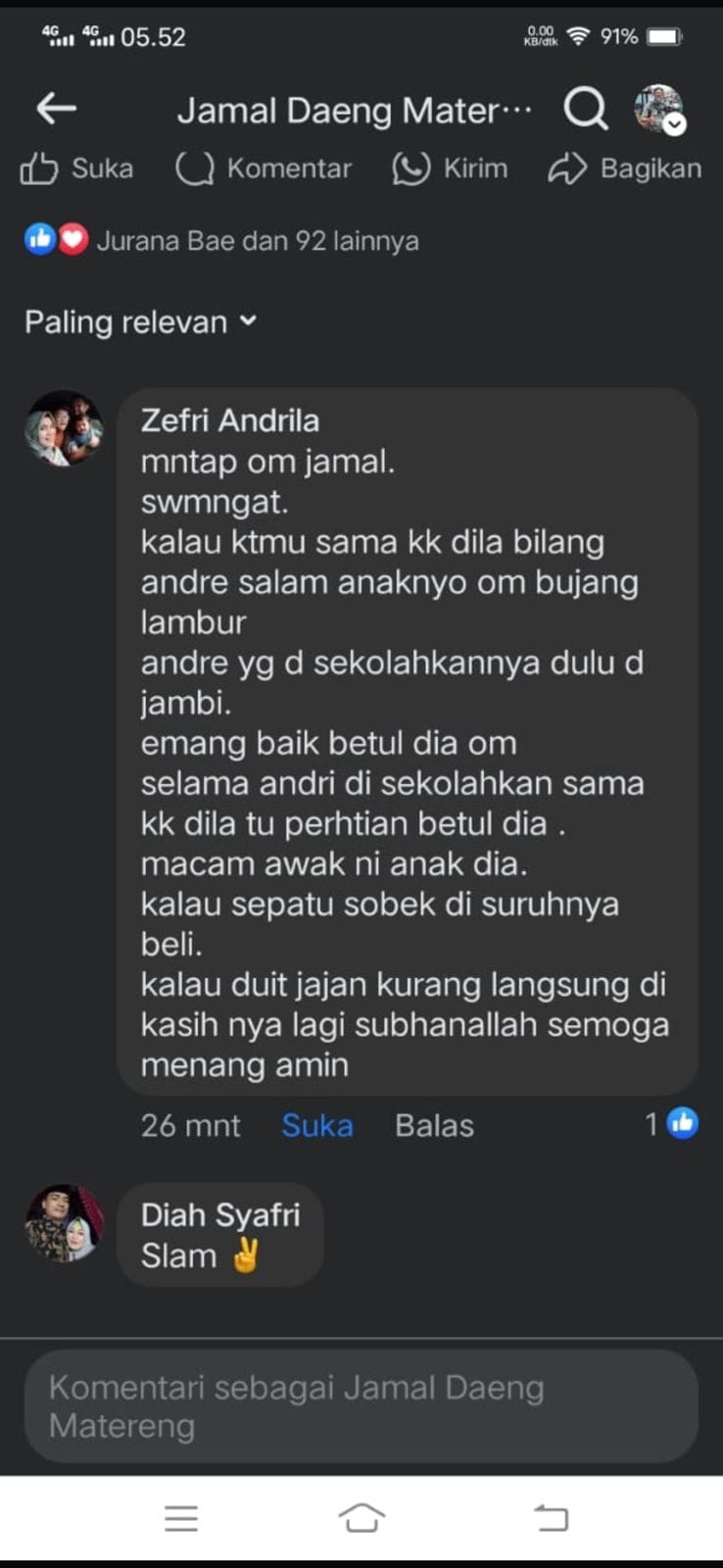 “Mantap om Jamal, semangat. Kalau ketemu sama kak Dilla bilang Andre salam, anaknyo om Bujang Lambur. Andri yg d sekolahkannya dulu d jambi,” tulis Andre.