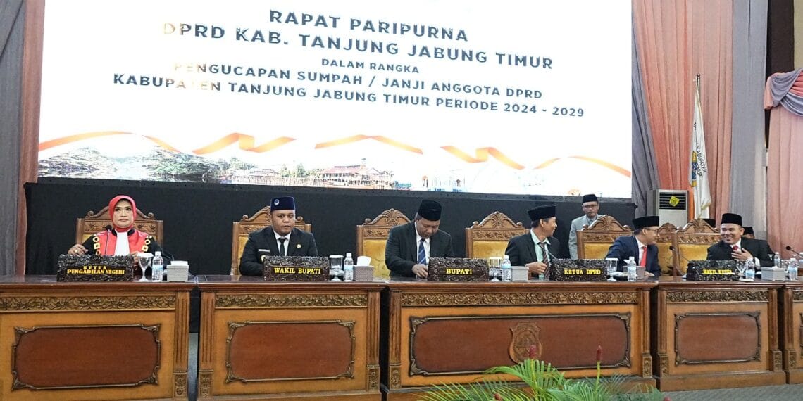 Kabar Sabak – Bupati Kabupaten Tanjung Jabung Timur Romi Hariyanto dan Wakil Bupati Robby Nahliyansyah menghadiri sidang paripurna pengucapan sumpah,janji anggota DPRD terpilih masa Jabatan 2024-2029 di Gedung DPRD Kabupaten Tanjabtim senin (2/9).