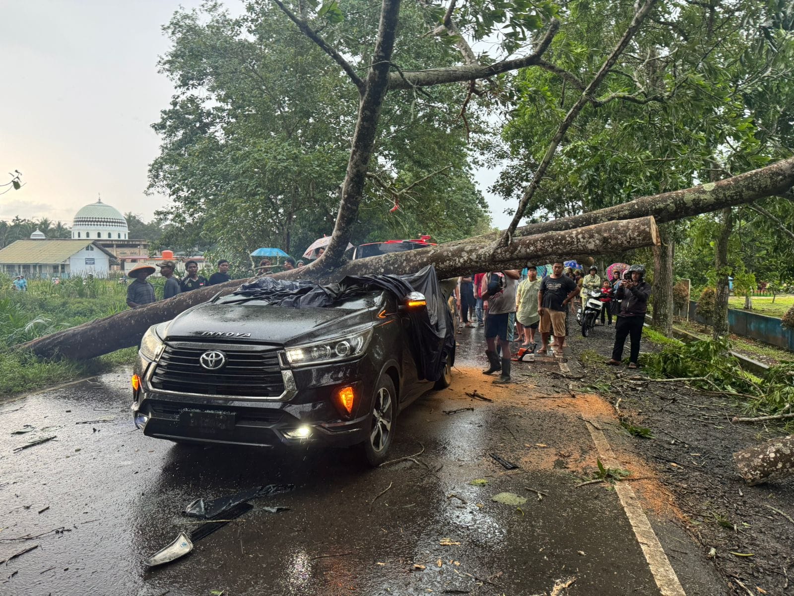 Menurut informasi, kejadian terjadi ketika kendaraan melintasi jalur lurus beraspal dalam kondisi hujan deras. Sebuah pohon besar di tepi jalan tiba-tiba tumbang dan menimpa kendaraan yang melaju tersebut. Lokasi kejadian diketahui berada di dekat permukiman warga. Saksi mata di lokasi, Yusmanidar (40), warga Kelurahan Rano, Kecamatan Muara Sabak Barat, menjelaskan bahwa hujan deras disertai angin kencang melanda kawasan tersebut sebelum pohon tumbang.(redaksi)